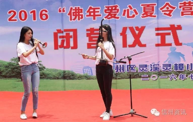 在闭营仪式上,华东师大支教大学生和灵樟小学学生们集体表演了集体诵读《我们结业啦》,四重唱《银色月光下》,课本剧《半截蜡烛》,唢呐独奏《北京一夜》,集体唱响《歌声与微笑》等节目,展现出了较高的艺术水平, 赢得到场嘉宾们的阵阵掌声,同时还举行了华东师大“老基地牌”交接仪式和图书与教具捐赠仪式,进行了“让梦想飞 让爱相随”图文展览和黏土作画、叶脉书签、手工茶叶蛋、太阳能双动力小汽车等手工作品展示,让大家直观地感受到“佛年”爱心夏令营的丰硕成果。