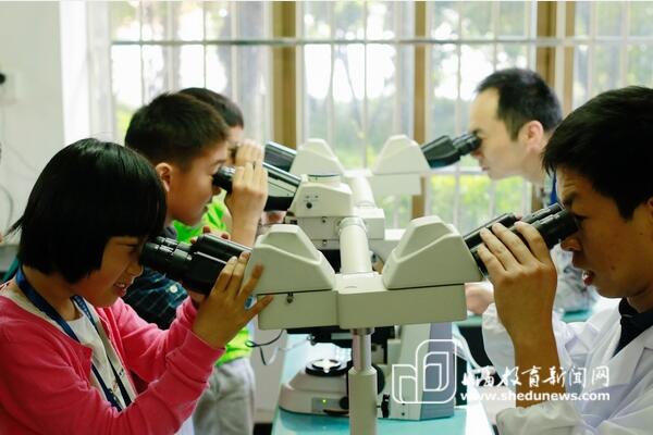 小朋友们正在体验显微镜。
