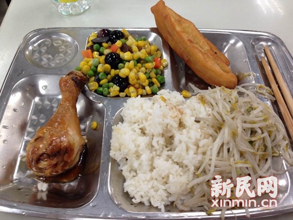 一道“小清新”的玉米炒葡萄,一根金黄的油条灌蛋,一个肉丸或鸡腿,一份青菜或生菜或豆芽,再加一份豆腐羹或番茄蛋汤,这是华东师大今天特别为每位毕业生免费配置的毕业套餐。