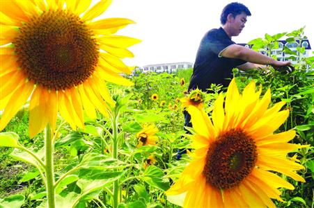 种植第一片向日葵的王老师在打理他和学生们的劳动成果。青年报记者 常鑫 摄