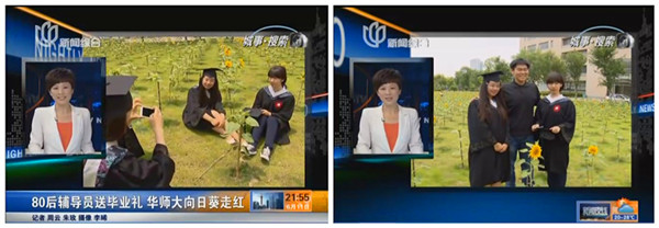 毕业生戚纤云穿着学士服和小伙伴在花海里流连了半晌,“想不到辅导员老师这么有心思,当时我还跟他一起去播种,完全没想到会是如今这番美景和这么内敛而温暖的毕业祝福。大家拍完照片,有的分享微博,有的PO上了朋友圈,大量的刷屏下,我们现在都说,今后师大的向日葵就快要和同济的樱花媲美了!”