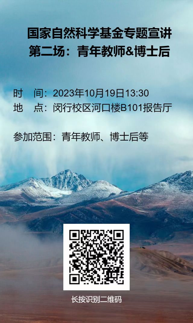 召开时间:2023年10月19日(周四)13:30 召开地点:闵行校区河口楼B101报告厅 参加范围:青年教师、博士后等