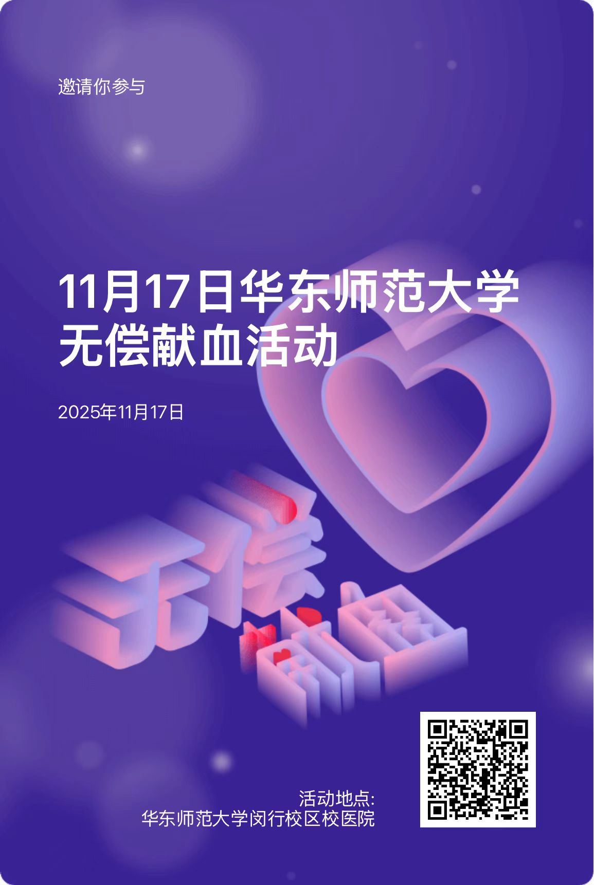 根据上海市血液管理办公室《2025年上海高校献血安排表》(华东师大)和《2025年上海市高校自愿无偿献血目标分解表》的要求, 为继续做好2025年我校师生自愿无偿献血工作,现定于11月17日开展无偿献血补献血工作,现就有关事项通知如下: