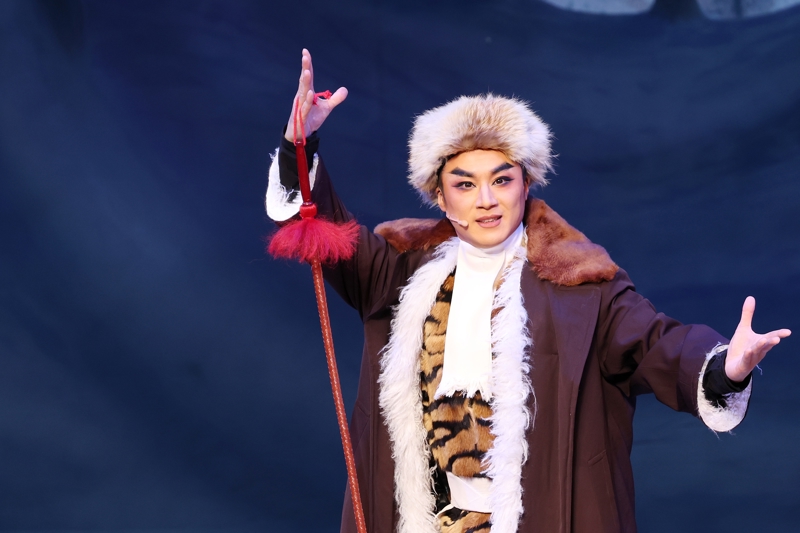 作为戏曲界凤毛麟角的文武全才老生,蓝天不仅具备扎实的唱念做打功底,更以深厚的舞台积淀、充沛的艺术能量及对角色多维度的人文诠释,展现出成熟演员的黄金艺术质态。演出现场,经典唱段“打虎上山”“穿林海跨雪原气冲霄汉”的高腔华彩,把全场氛围推向了高潮。蓝天的声腔驾驭得炉火纯青,音域开合游刃有余,让人不由感叹“祖师爷赏饭吃”。随后的高难度身段和复杂唱腔,进一步展示出演员所具备的充沛的体力、高超的气息与身段技巧,这和其多年如一日的刻苦训练是分不开的。马鞭和皮氅在杨子荣手中挥洒自如,一连串跳叉、跨腿、蹉步飘逸潇洒;忽然一阵虎啸,杨子荣又以摔叉、旋子等高超技巧表现马惊虎追的场面。这段早已家喻户晓的戏,因着蓝天的精彩演绎,依然让观众有身临其境之感。他身段轻盈且有力量,尽显传统程式的美感和现代英雄气概,随后又气定神闲地完成[西皮快板]“党给我智慧给我胆”,唱得台上台下都情绪激昂。