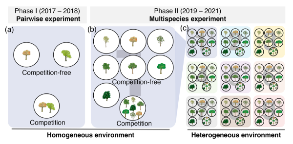 围绕处于竞争劣势的植物将如何维持自身种群这一问题,研究团队通过为期3年的幼苗实验,基于10个乔木物种6750株幼苗的10个关键功能性状,从简单的两物种竞争到复杂的多物种竞争,从均质的非生物环境到异质的非生物环境,全面系统地检验了不同情境下种内性状的变化特征。