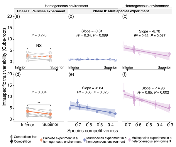 实验研究表明,在缺乏竞争的均质环境中,种内性状变异与物种竞争能力之间相互独立。但是,一旦引入种间竞争或空间异质环境,这两者之间就显示出强烈的权衡关系。具体而言,竞争能力较弱的物种(“穷”),会展现出更高的种内性状变异(“变”)。