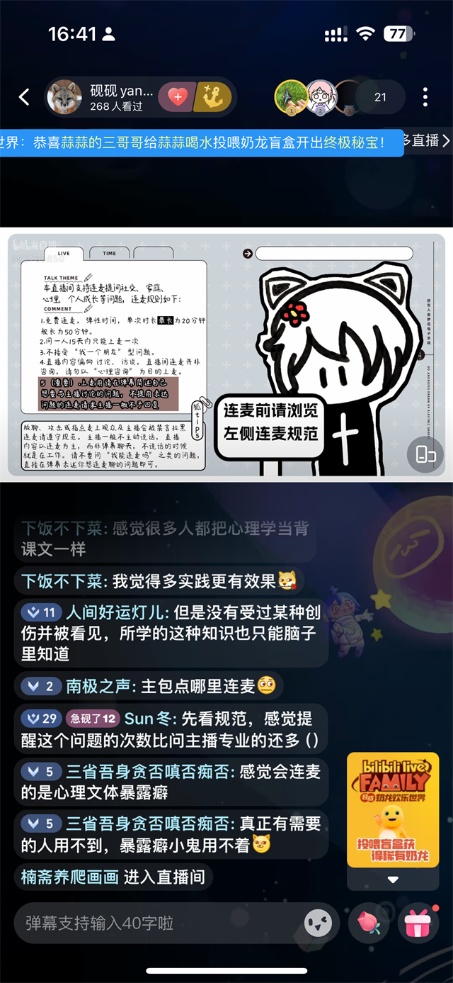 如今,这类心理直播间已遍布哔哩哔哩、微信、小红书等各大社交平台。主播普遍采用“只连麦、不露脸”的形式,与年轻网友对话。不过,各直播间的连麦规则并不统一:有的可免费连麦,有的则需要关注、加入粉丝团或打赏礼物才能获得连麦资格,单次连麦时长一般在15到30分钟。除了连麦对话,部分直播间还会穿插读书分享、心理讲座等科普内容。