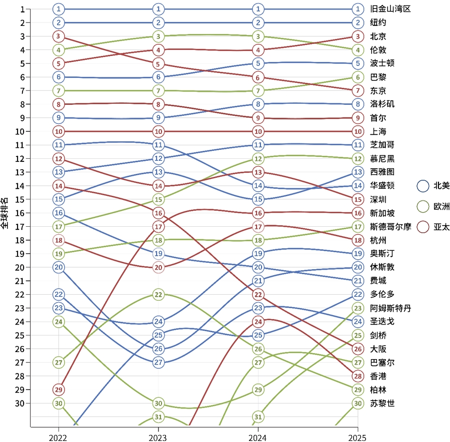 然而,三角内部动态各异:北美地区地位稳固,而欧洲呈现复苏趋势——尽管伦敦被北京超越,但伦敦、巴黎、慕尼黑等核心城市依然保持全球前列,斯德哥尔摩、阿姆斯特丹以及剑桥、苏黎世等众多名城排名增长,在全球创新环境支撑能力持续冠绝全球。