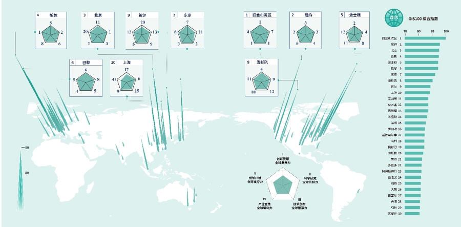 结果显示,全球科技创新中心前30强依次为:旧金山湾区、纽约、北京、伦敦、波士顿、巴黎、东京、洛杉矶、首尔、上海、芝加哥、慕尼黑、西雅图、华盛顿、深圳、新加坡、斯德哥尔摩、杭州、奥斯汀、休斯敦、费城、多伦多、阿姆斯特丹、圣迭戈、剑桥、大阪、巴塞尔、香港、柏林、苏黎世。