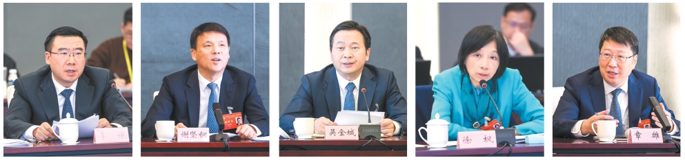 在十二届市委八次全会的讨论中,市委委员李谦、谢坚钢、吴金城、徐枫、章雄(从左至右)发言。 均本报记者 袁婧摄
