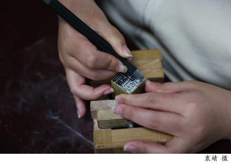 图为来自塔吉克斯坦的留学生李欣冉(中文名)在华东师大书法篆刻研究生同学的指导下体验篆刻艺术,亲手用刻刀将自己的中文名字刻成印章。