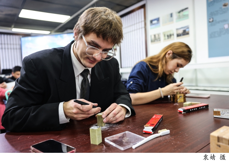 昨天下午,来自华东师范大学国际汉语文化学院的十余位外国留学生,包括俄罗斯、塔吉克斯坦、蒙古等国学子齐聚现场,沉浸式感受中国篆刻的独特魅力。来自俄罗斯的留学生赵吉(中文名)表示,他被篆刻艺术所吸引,沉浸其中。