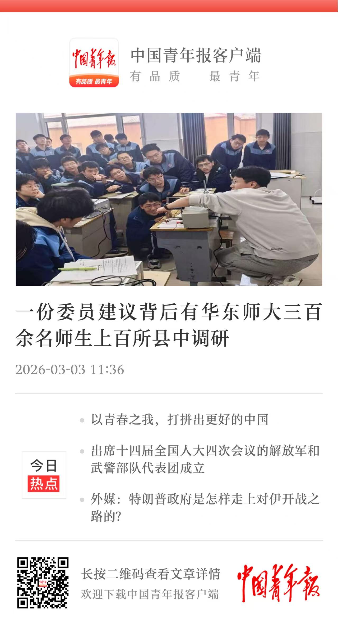 中国青年报客户端 | 一份委员建议背后有华东师大三百余名师生上百所县中调研