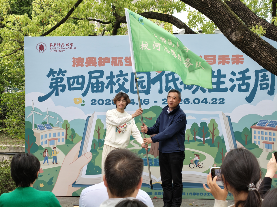 恰逢普陀校区丽娃河综合治理工程验收之年,护河成为贯穿本次低碳生活周全程的亮点行动。华东师大“校河志愿服务队”日前成立,上海市水利管理事务中心相关负责人为志愿团队授旗,一支常态化护河青年队伍从此正式上岗。