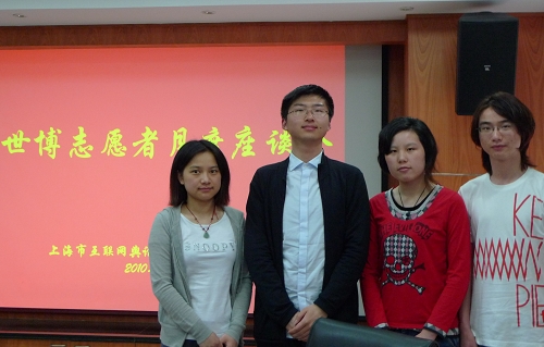 图为受表扬的我校4位世博志愿者 上海市网宣办近日给我校党委宣传部发来通报,表扬中文系崔隽、传播学院管烨和外语学院王弢、丁燕茹4位大学生。 这4位学生于3月下旬被选派到网宣办,积极参与上海世博会舆情...