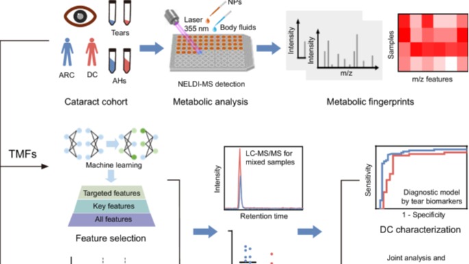 泪液作为一种完全无创、易于获取的眼部体液,蕴含着丰富的疾病分子信息,是理想的无创诊断生物标志物来源。 精准医学时代,探索疾病的微小分子变化已成为诊断与治疗的关键。糖尿病性白内障作为糖尿病患者的常见并发症,其术前精准诊断对于降低手术风险、改善预后至关重要。 上海交通大学医学院附属第九人民医院眼科苏蕴副研究员、范先群教授、郭涛主任医师与华东师范大学万晶晶教授团队合作,开发了一种基于纳米颗粒...