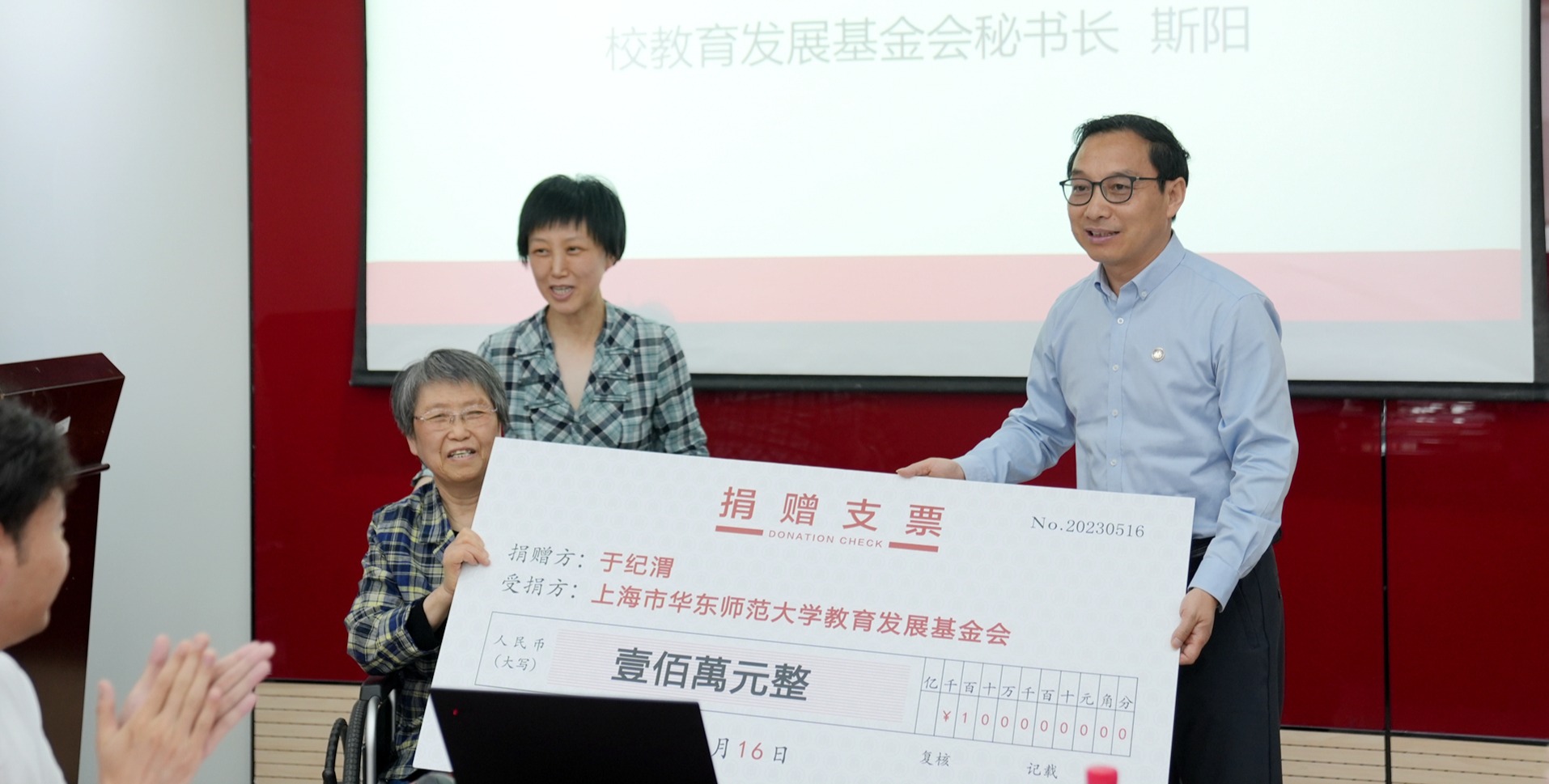 2021年9月19日,华东师大老教授于纪渭在弥留之际立下遗嘱将100万元积蓄捐赠学校。2023年5月16日上午,于纪渭先生的遗孀、华东师大64级数学系校友何月英女士携女儿何海霞来到闵行校区,实现于纪渭先生的这一临终心愿。于纪渭专项基金捐赠仪式举行 校党委常委、副校长、马克思主义学院院长顾红亮,校友会秘书长、教育发展基金会秘书长斯阳,国有资产管理处处长王淑仙,老干部党委书记、老龄工作委员会办公室主任张军,教育...